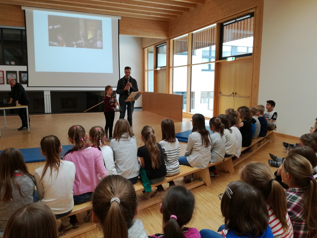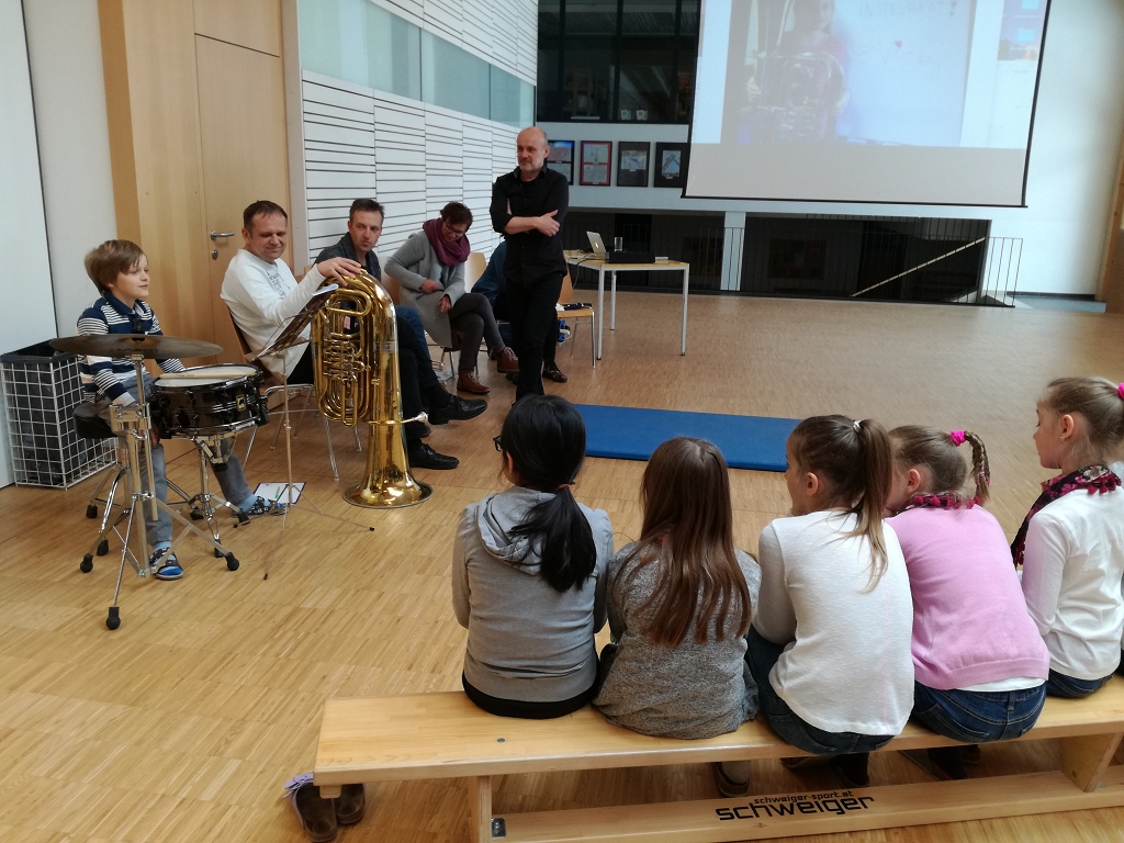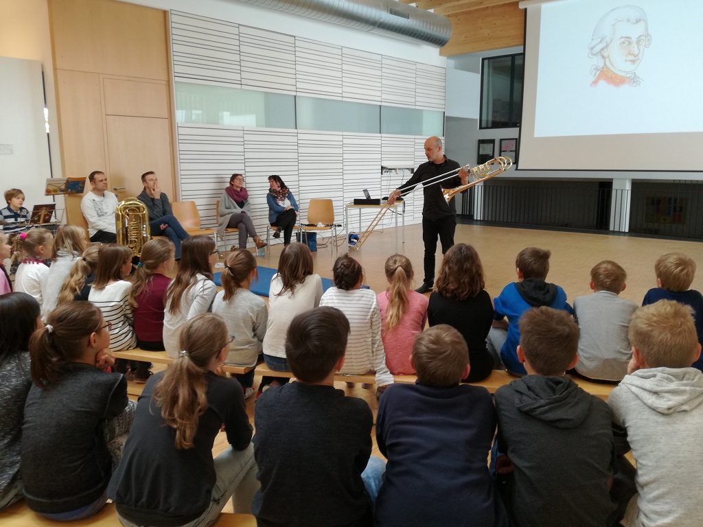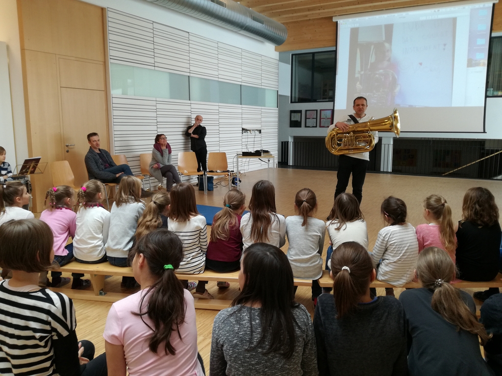 Der Autor der Geschichte, Rupert Hörbst, brachte den Kindern dabei die Abenteuer von Prof. Dr. Gugelhupf näher. Daneben stellten die Musiker der beiden Musikvereine die Instrumente, die in den Liedern vorkommen, vor. Die Kinder bekamen Hörproben und durften die Instrumente auch selber ausprobieren. Ziel dieses Projektvormittags war es, dass die Kinder die Geschichte aktiv erleben, dass sie die beiden Musikvereine kennenlernen, aber auch Interesse am Erlernen eines Instruments zu erwecken. Junge Talente zum Erlernen eines Instrumentes zu motivieren ist eine Kernaufgabe jedes Musikvereins, damit der Fortbestand dieses Kulturguts gesichert ist. Das große Interesse der Kinder zeigte ganz klar, dass auch in der heutigen Zeit Kinder von der Faszination Musik angesteckt werden können.